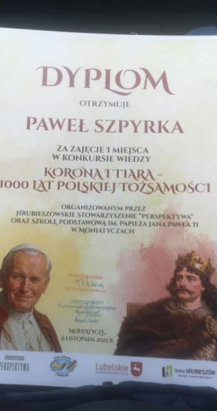 Jest nam niezwykle miło poinformować, że uczeń klasy 7 Paweł Szpyrka zajął 1 miejsce w konkursie wiedzy „Korona i tiara. 1000 lat polskiej tożsamości” organizowanym przez Hrubieszowskie Stowarzyszenie Perspektywa oraz Szkołę Podstawową im. Papieża Jana Pawła II w Moniatyczach. Oprócz Pawła w konkursie wzięły udział także Julia Khoroshun uczennica klasy 7 oraz Julia Bielecka uczennica klasy 8. Wszystkim uczestnikom konkursu serdecznie gratulujemy!